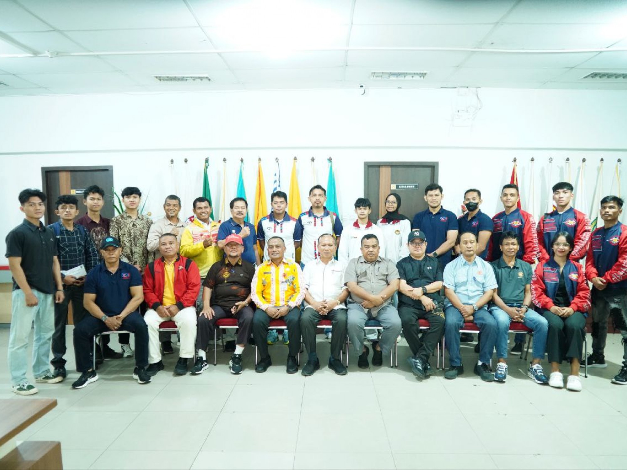 Kepala Dinas Kepemudaan dan Olahraga Provinsi Riau H Yurnalis Basri SSos MSi didampingi Kepala Bidang Pembudayaan Prestasi Olahraga Rinov Eka Mondrie S STP MSi melapas keberangkatan Atlet Pekan Olahraga Nasional (PON) Beladiri, Kamis (9/10/2025).